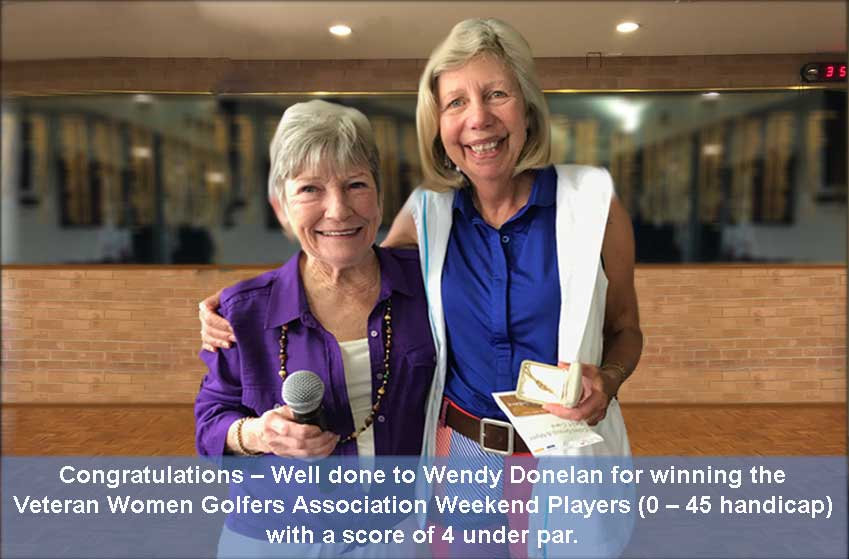 Congratulations – Well done to Wendy Donelan for winning the Veteran Women Golfers Association Weekend Players (0 – 45 handicap) with a score of 4 under par.
